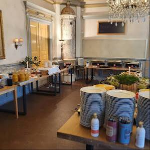 Tunnelmallinen buffetravintola kauniilla tulisijoilla ja kattokruunuilla. Yksinkertaiset ateriat. Salaatteja voi olla kaksi erilaista. Tänään oli: salaattia 🥬 jäävuori, salaatinlehtiä 🥬 tomaateilla, riisisalaatit, perunat 🥔 tillillä; sienikeittoa 🍜🍄, escalopea, simpukoita, ilmeisesti pieniä lapsia, kahvia ☕️ teetä ja keksejä. Makea vesimeloni. Et jää nälkäiseksi.