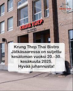 "summary": "Krung Thep Thai Bistro Jätkäsaari on suosittu thairavintola Helsingin Jätkäsaarissa, tarjoaa erinomaiset palvelut ja monipuoliset ruokailuvalikoimat.",