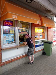 Helppo poiketa ohikulku matkalla syömään. Ulkoa löytyy myös pöytiä, jossa voi syödä.