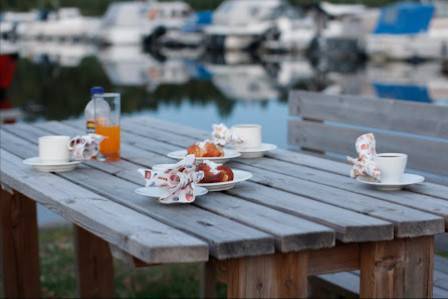 Palvelu on iloista ja nuoret ovat oikeassa asenteessa palvelemassa. Arkisin soppalounas klo 14 saakka, grilliannoksia ja täytettyjä sämpylöitä, myös salaatteja. Kahvia, teetä, limsaa, itse tehtyjä munkkeja, pullaa ja jäätelöä. Oluttakin löytyy hanassa. Pöydät ulottuvat rantaan saakka, mutta terassilta löytyy myös varjopaikkoja. Pysäköinti ilmaiseen on mahdollista, kun muistaa naputella rekisteritunnus padiin.