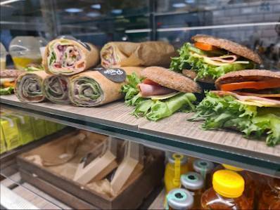 Ystävällinen palvelu ja erikoisruokavalioista tietävä henkilökunta. Kahvin santsikuppi kuului hintaan. Mukava pysähdys päivään. Tilat avarat ja väljästi asetellut pöydät, hyvät leveät käytävät.
